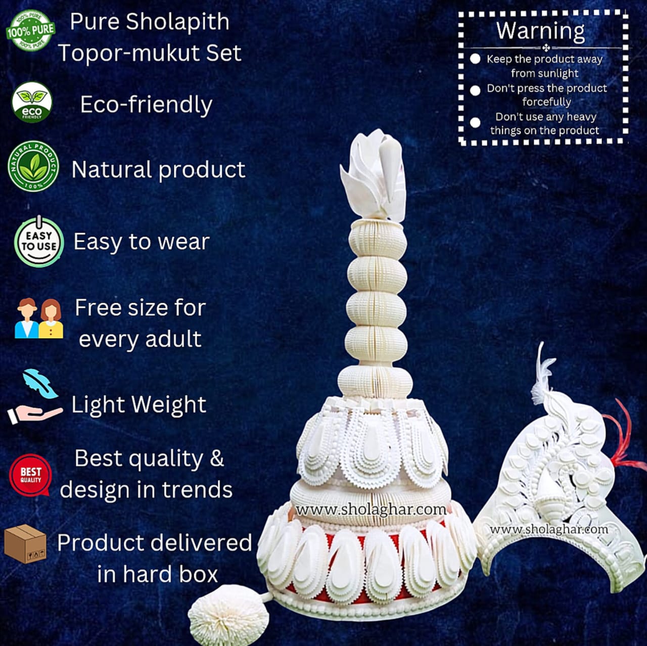 Shola ghar Celebrate the traditions of a Bengali wedding with this beautifully handcrafted Topor, an essential element of Bengali matrimonial rituals. Rooted in rich cultural heritage, this elegant set is worn by both the bride and groom during the wedding ceremony, divine blessings, and marital bliss.