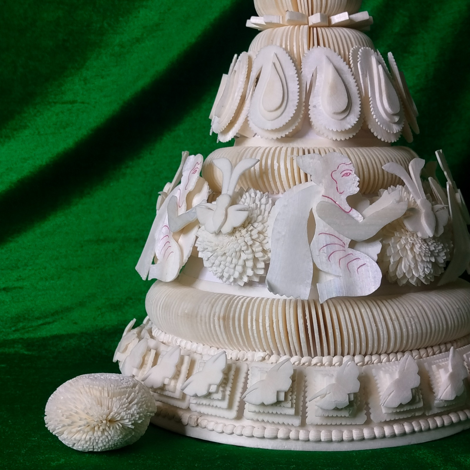 The Topor is a traditional conical headgear worn by the groom, while the Mukut is the ornate crown worn by the bride. Both are made using lightweight shola (Indian cork) and embellished with delicate, intricate patterns that reflect Bengal’s artisanal craftsmanship.
