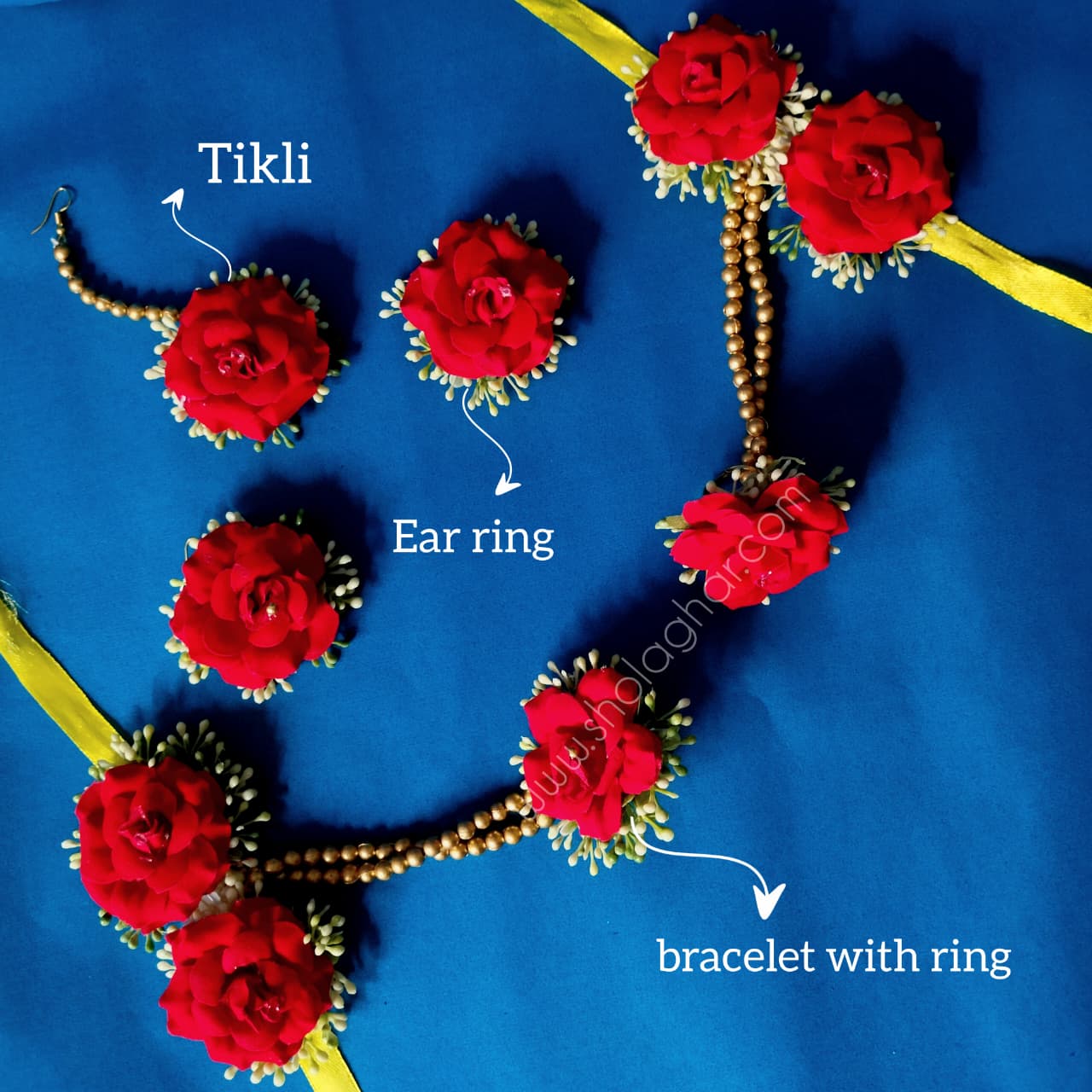 Haldi jewellery is a beautiful blend of tradition, nature, and elegance, specially designed for the vibrant Haldi ceremony in Indian weddings. Unlike heavy gold or diamond ornaments, Haldi jewellery is crafted from fresh or artificial flowers, beads, shells, and pearls, reflecting the joyous and colorful spirit of the occasion. The pieces usually include floral necklaces, earrings, maang tikka, haathphool, anklets, and bangles, all coordinated in bright hues of yellow, white, pink, or green to complement the bride’s Haldi outfit.