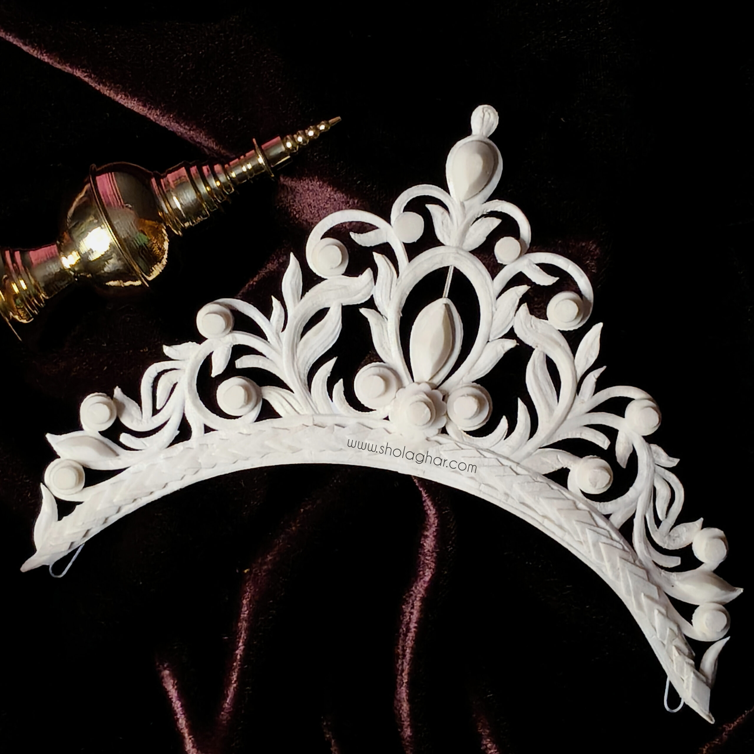 The mukut is a small, lightweight crown made from shola (a soft white plant material). It is worn by Bengali brides and goes perfectly with a Benarasi saree. The design is handmade with care and often decorated with red or golden touches.