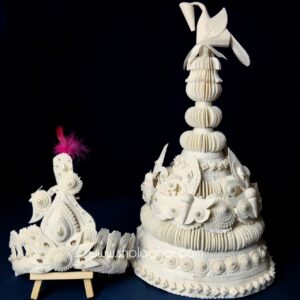 The Topor is a traditional conical headgear worn by the groom, while the Mukut is the ornate crown worn by the bride. Both are made using lightweight shola (Indian cork) and embellished with delicate, intricate patterns that reflect Bengal’s artisanal craftsmanship.
