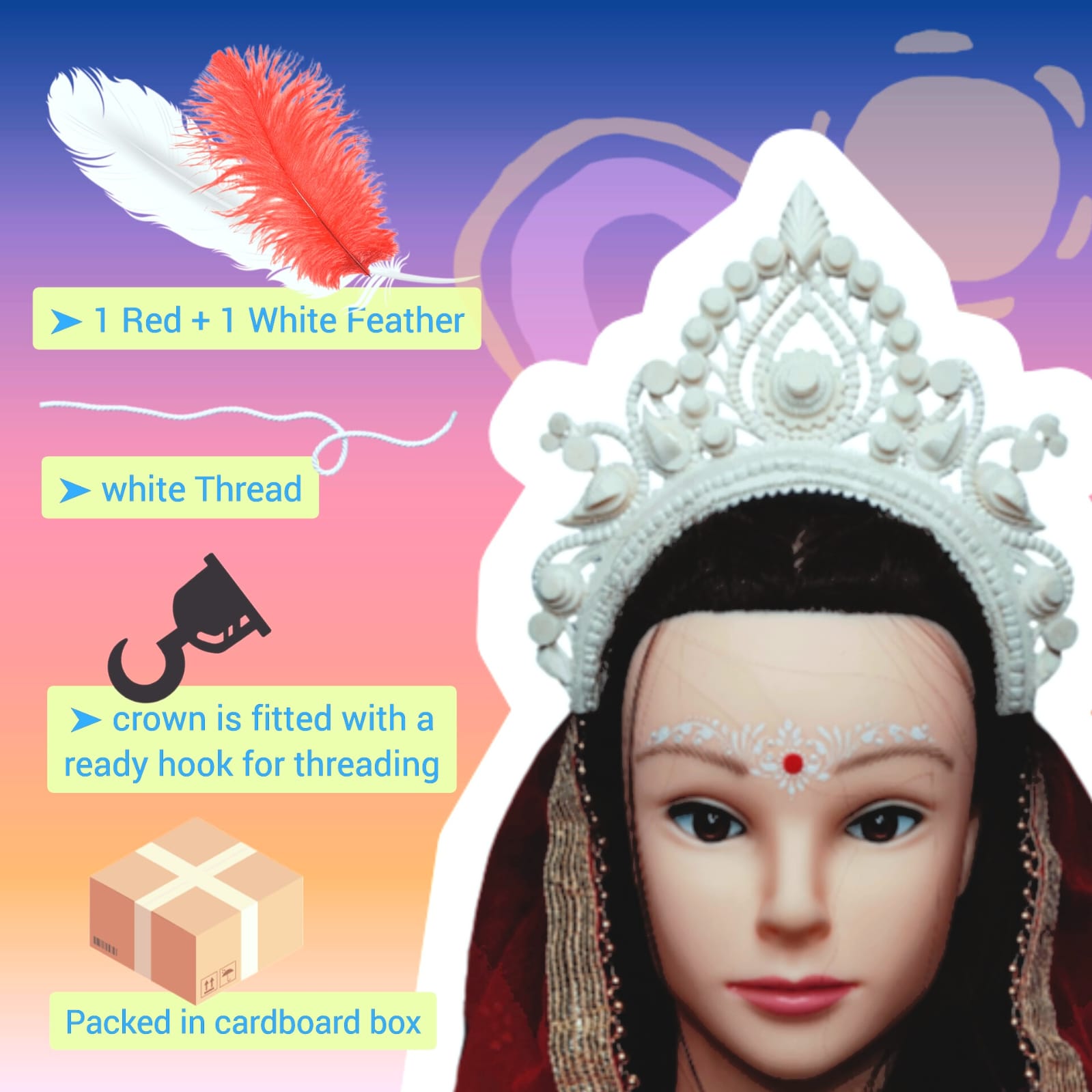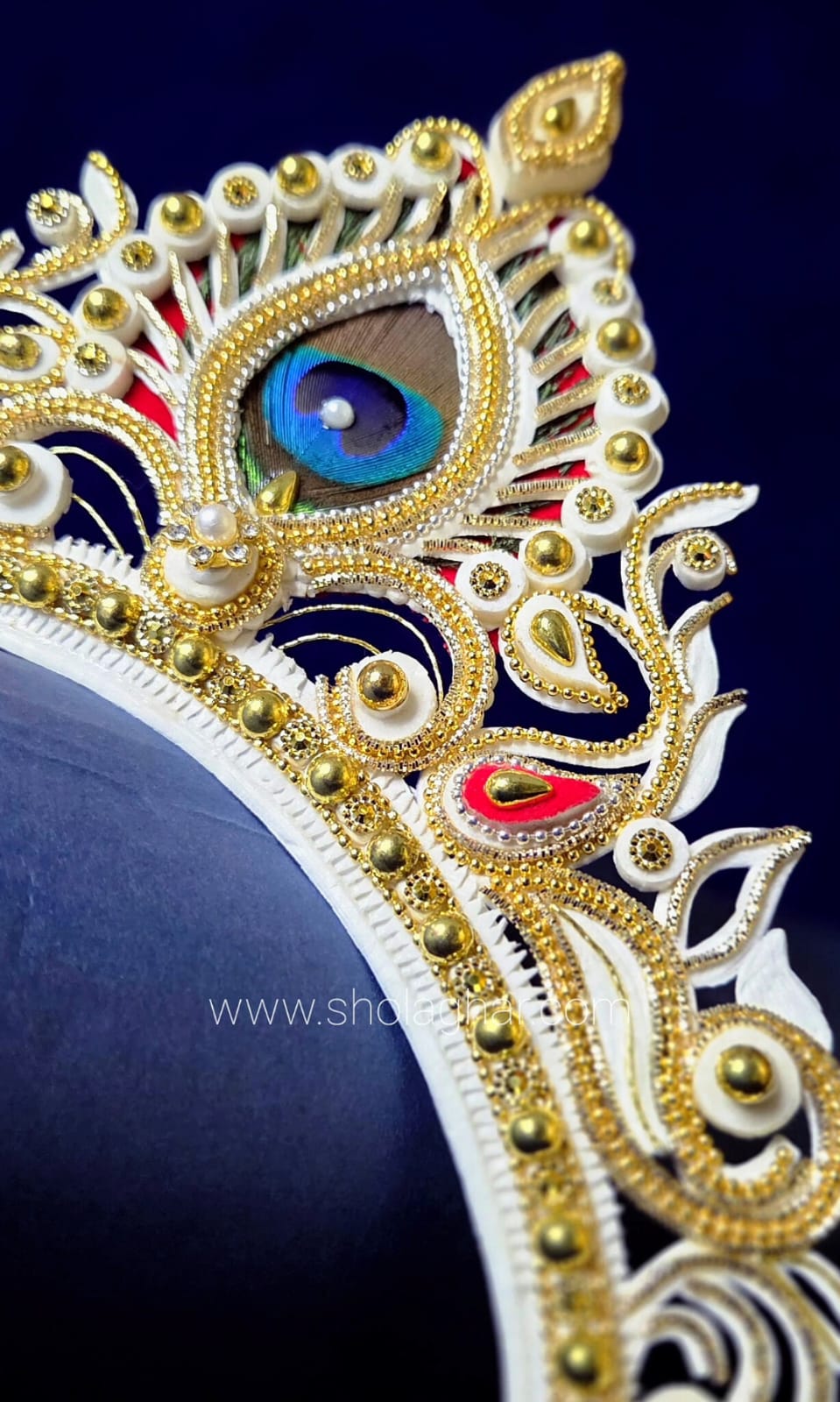 The mukut is a small, lightweight crown made from shola (a soft white plant material). It is worn by Bengali brides and goes perfectly with a Benarasi saree. The design is handmade with care and often decorated with red or golden touches.
