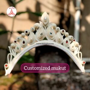 The mukut is a small, lightweight crown made from shola (a soft white plant material). It is worn by Bengali brides and goes perfectly with a Benarasi saree. The design is handmade with care and often decorated with red or golden touches.