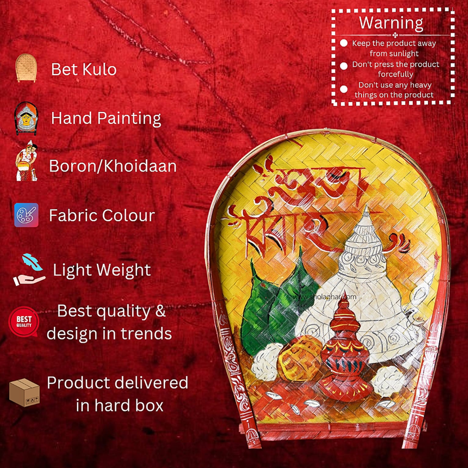 At Shola Ghar, our skilled artisans make over 250 Boron Kulos every month. Each one is carefully handcrafted and decorated with bright colors, zari work, beads, and traditional designs like the Swastik or Alpana, showing the beauty of Bengali culture.