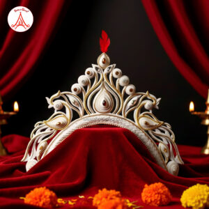 The mukut is a small, lightweight crown made from shola (a soft white plant material). It is worn by Bengali brides and goes perfectly with a Benarasi saree. The design is handmade with care and often decorated with red or golden touches.