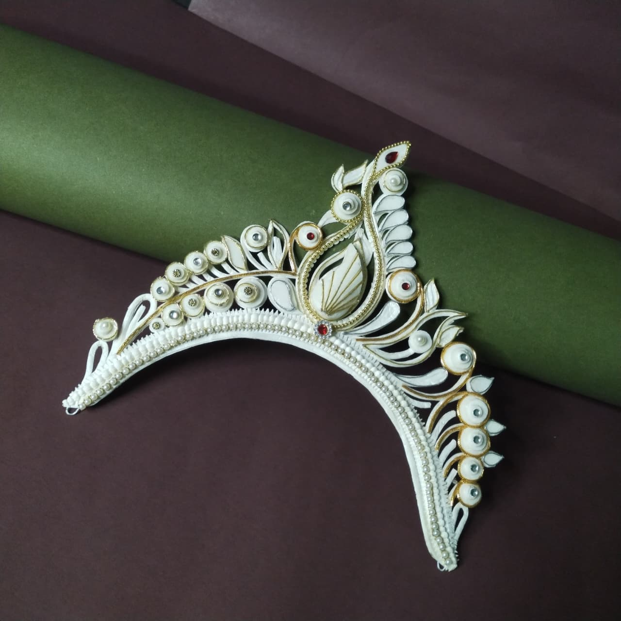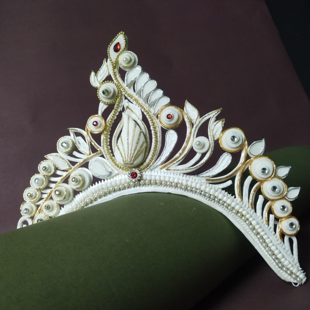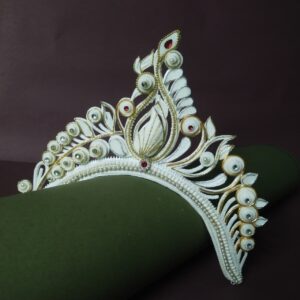 The mukut is a small, lightweight crown made from shola (a soft white plant material). It is worn by Bengali brides and goes perfectly with a Benarasi saree. The design is handmade with care and often decorated with red or golden touches.