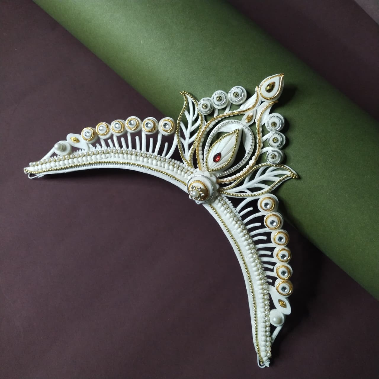 The mukut is a small, lightweight crown made from shola (a soft white plant material). It is worn by Bengali brides and goes perfectly with a Benarasi saree. The design is handmade with care and often decorated with red or golden touches.