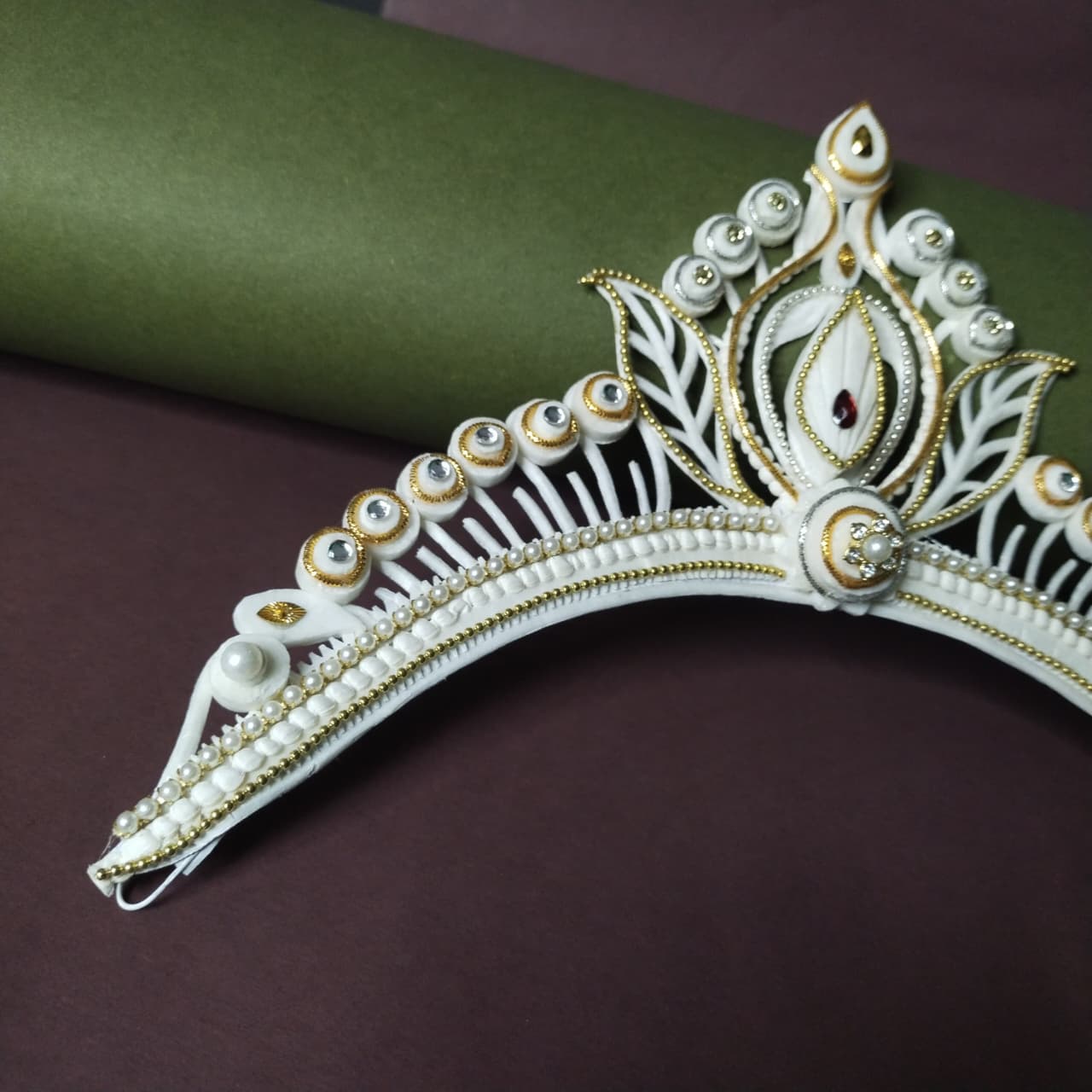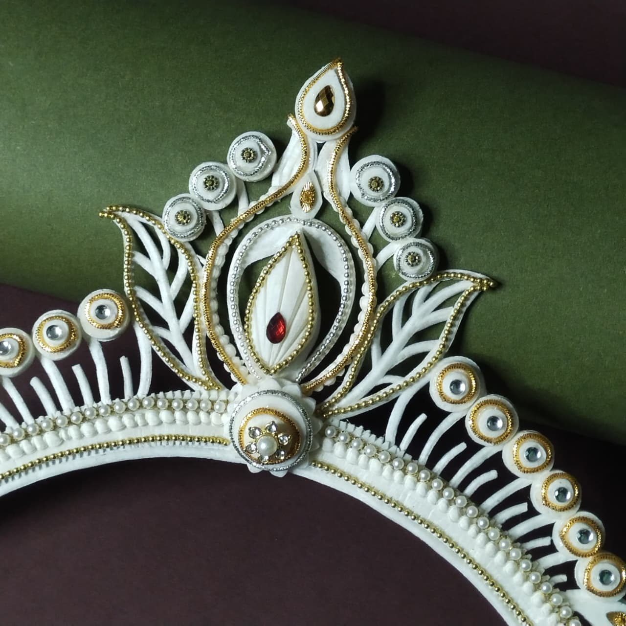 The mukut is a small, lightweight crown made from shola (a soft white plant material). It is worn by Bengali brides and goes perfectly with a Benarasi saree. The design is handmade with care and often decorated with red or golden touches.