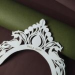 The mukut is a small, lightweight crown made from shola (a soft white plant material). It is worn by Bengali brides and goes perfectly with a Benarasi saree. The design is handmade with care and often decorated with red or golden touches.