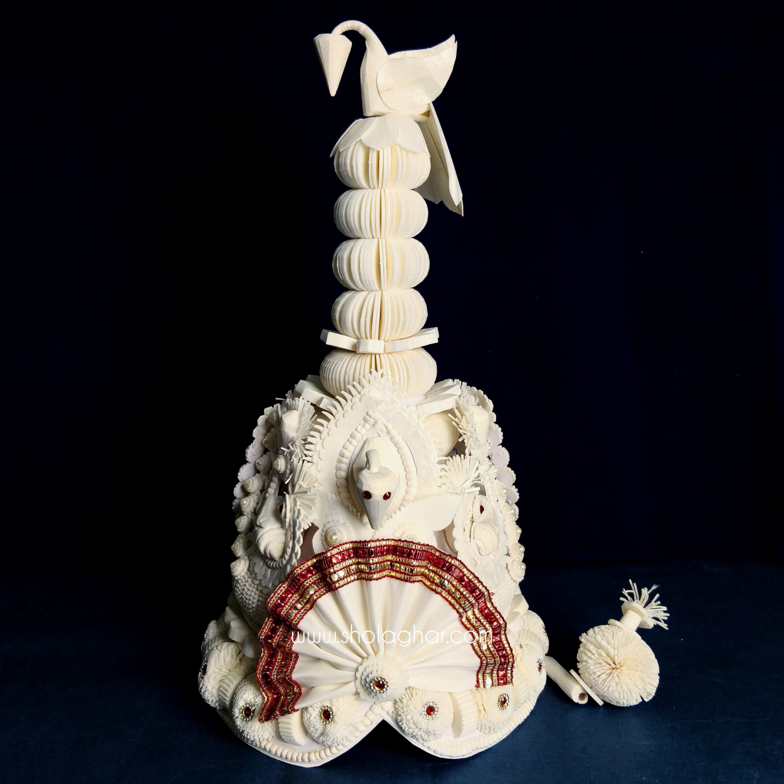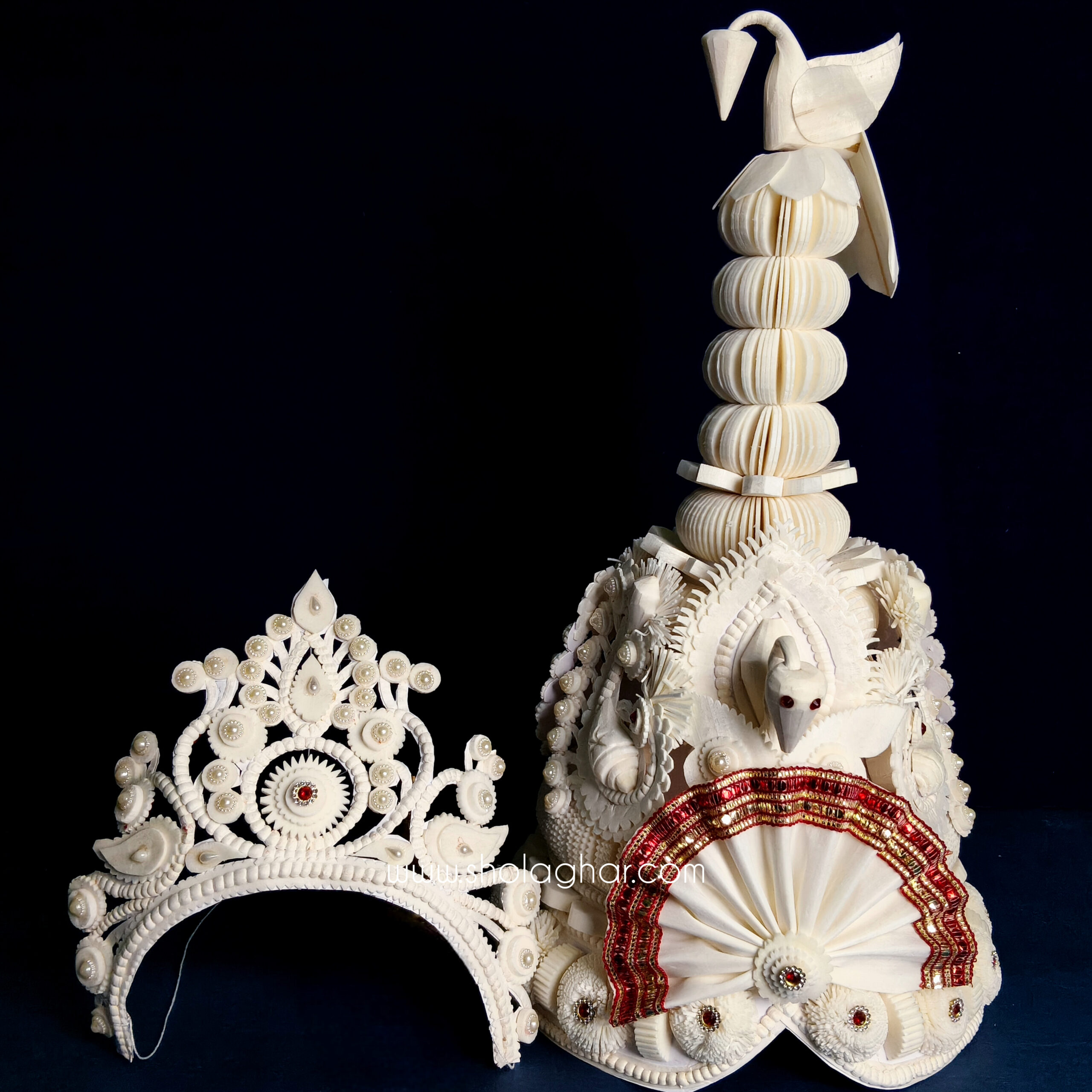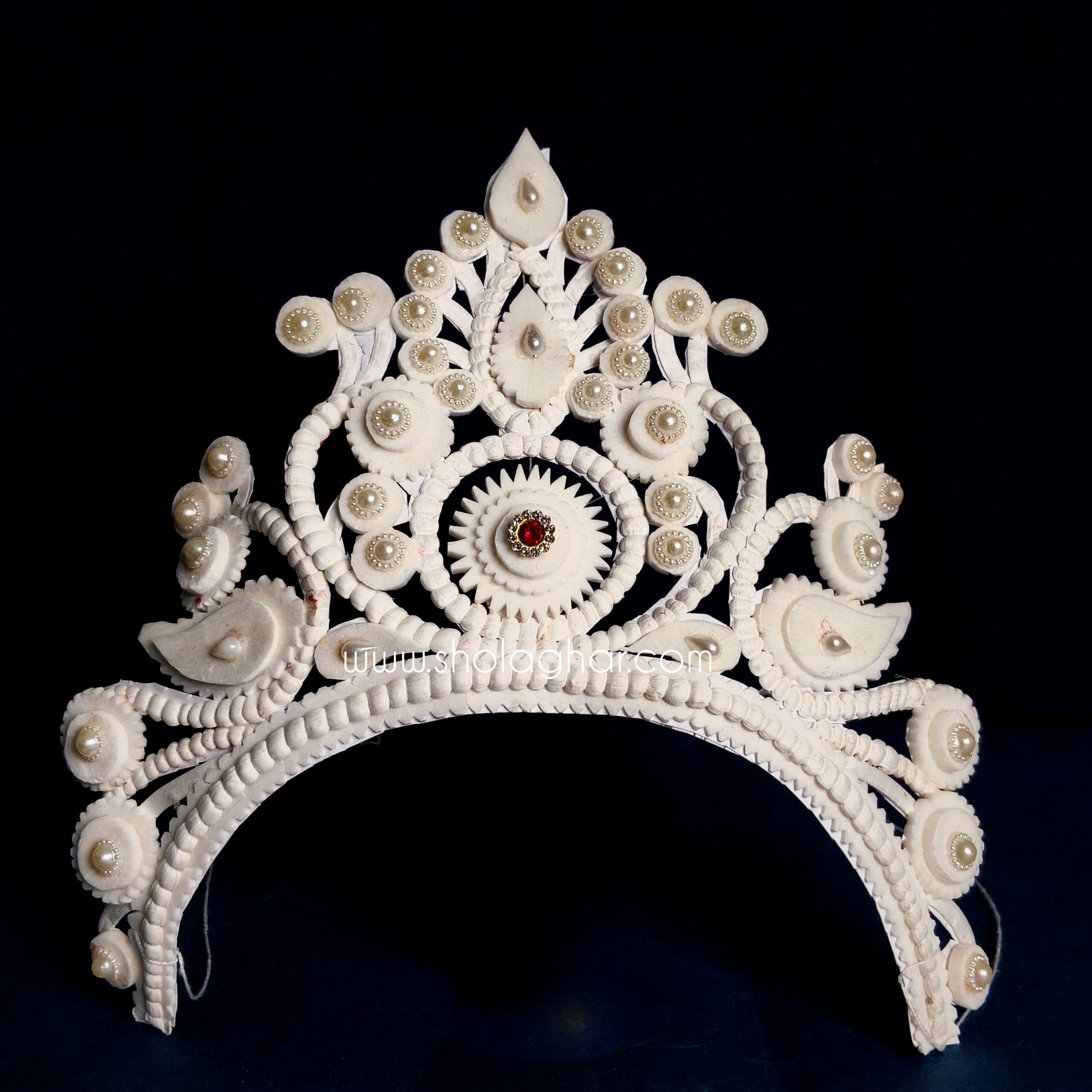 Shola ghar Celebrate the traditions of a Bengali wedding with this beautifully handcrafted Topor-Mukut Set, an essential element of Bengali matrimonial rituals. Rooted in rich cultural heritage, this elegant set is worn by both the bride and groom during the wedding ceremony, divine blessings, and marital bliss.