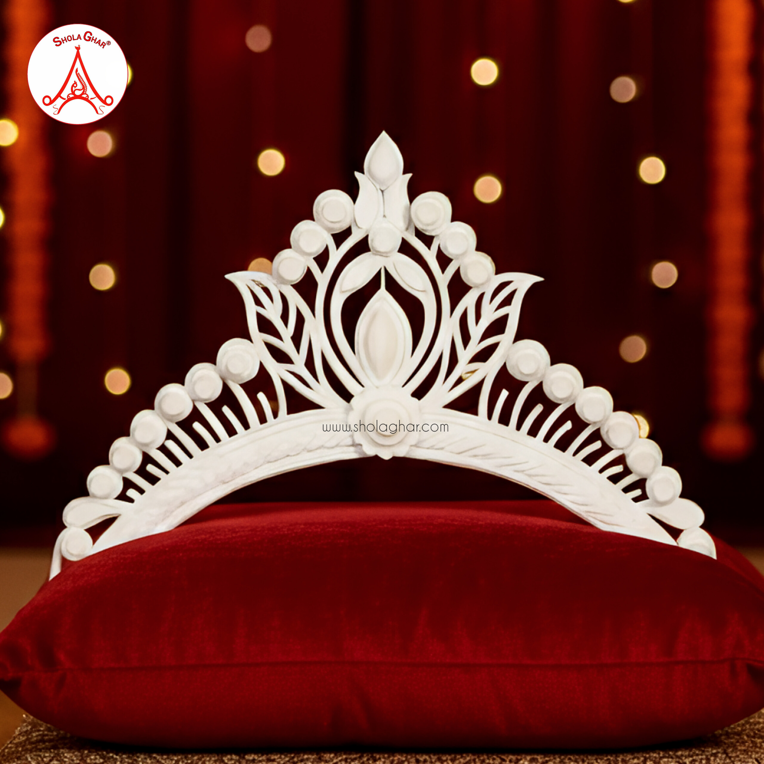 The mukut is a small, lightweight crown made from shola (a soft white plant material). It is worn by Bengali brides and goes perfectly with a Benarasi saree. The design is handmade with care and often decorated with red or golden touches.