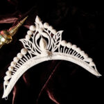 The mukut is a small, lightweight crown made from shola (a soft white plant material). It is worn by Bengali brides and goes perfectly with a Benarasi saree. The design is handmade with care and often decorated with red or golden touches.