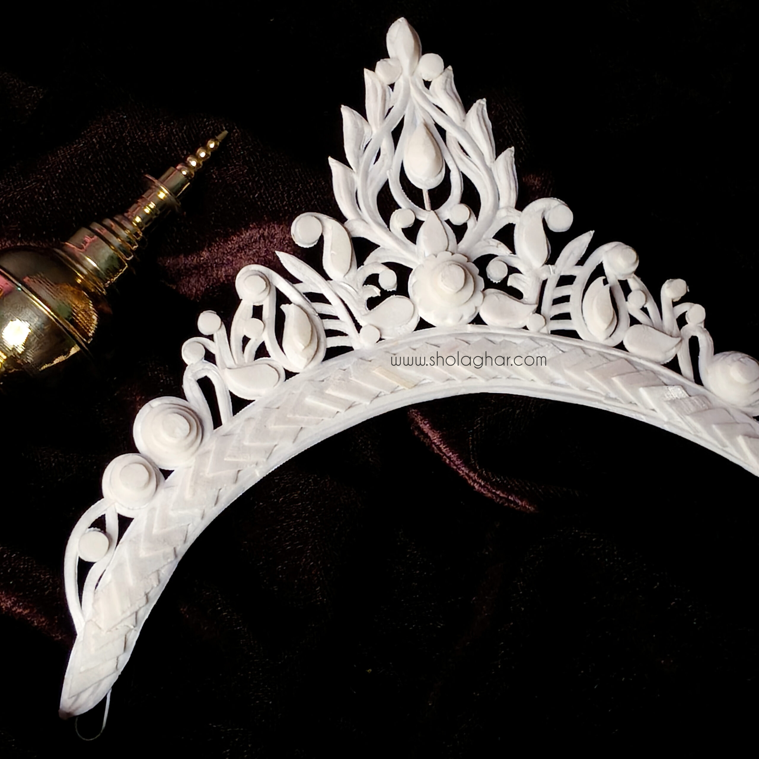 The mukut is a small, lightweight crown made from shola (a soft white plant material). It is worn by Bengali brides and goes perfectly with a Benarasi saree. The design is handmade with care and often decorated with red or golden touches.