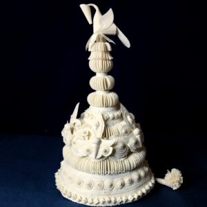 The Topor is a traditional conical headgear worn by the groom. Topor are made using lightweight shola (Indian cork) and embellished with delicate, intricate patterns that reflect Bengal’s artisanal craftsmanship.