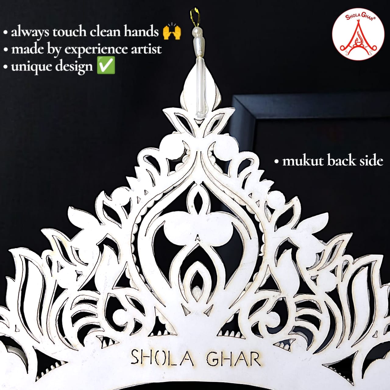 The mukut is a small, lightweight crown made from shola (a soft white plant material). It is worn by Bengali brides and goes perfectly with a Benarasi saree. The design is handmade with care and often decorated with red or golden touches.