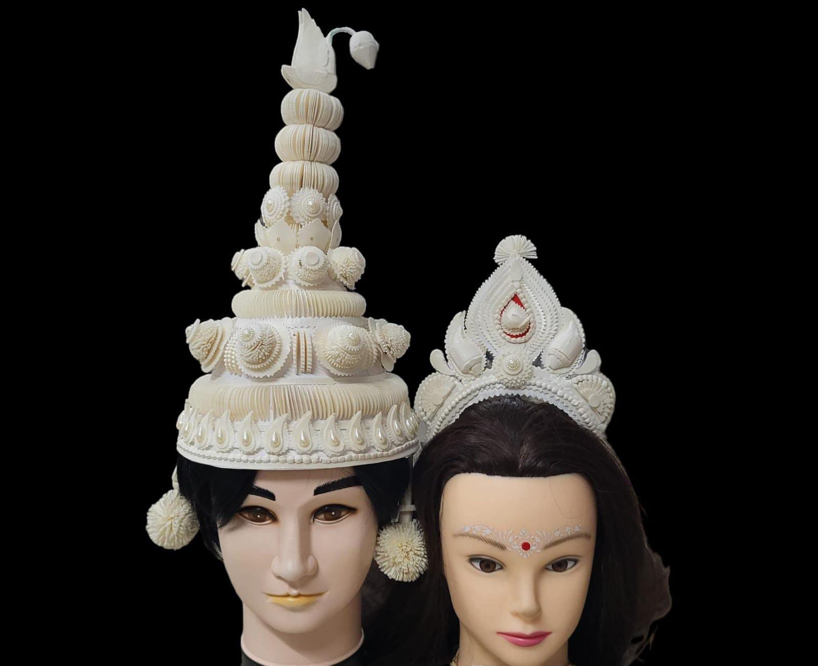 In Shola Ghar’s Topor-Mukut Set, both bride’s and groom’s headgear are there, which has been traditionally worn by them as part of the Bengali Hindu wedding ceremony.